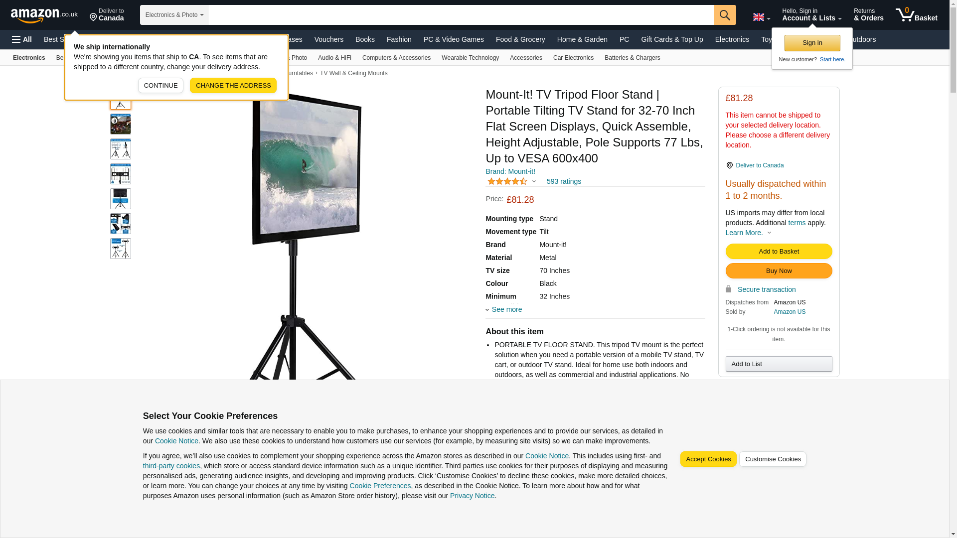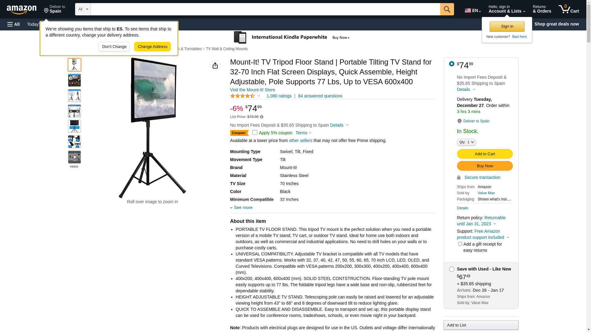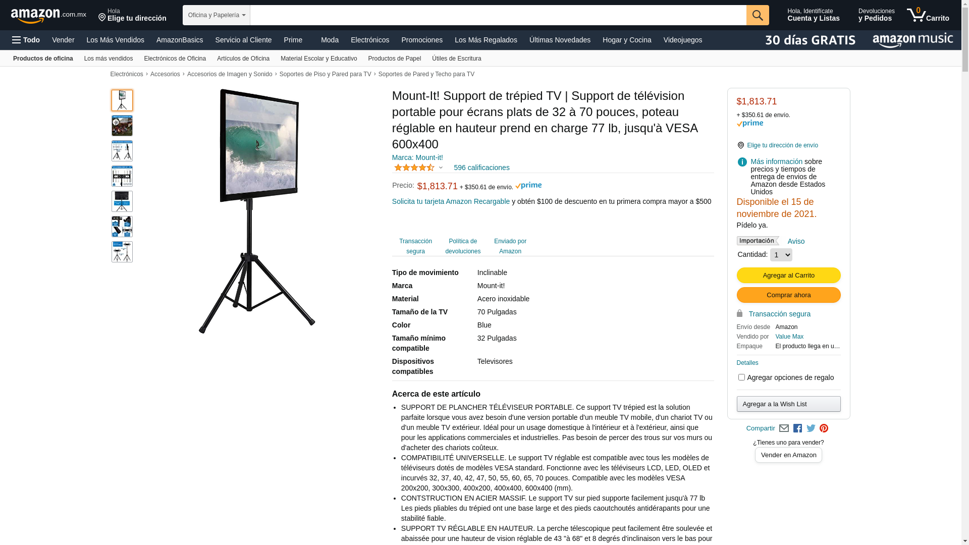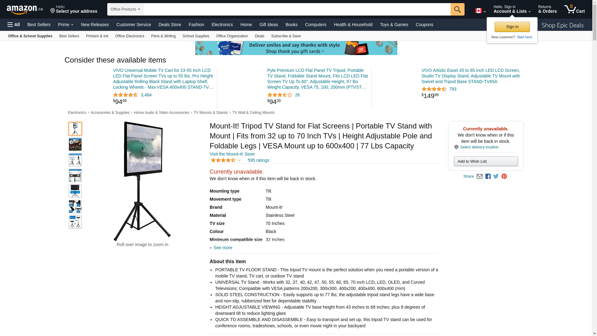 Mount-It! LCD Flat Panel TV Tripod, Portable TV Stand Fits LCD LED Flat Screen TV sizes 32-70 inch, Adjustable Height Pole, Supports up to 77 lbs and VESA 600x400 The MI-874 tripod TV mount is the perfect solution when you need a portable version of a mobile TV stand, TV cart, or outdoor TV stand. Easy to set up and dismantle for portable applications. Ideal for trade shows and for mobile presentation set up in conference rooms. The wide tripod base and integrated TV bracket lets you mount TV sizes from 32" to 70" at virtually any type of event. Height adjustable, tilting, and portable, this mount was designed for home, office, and commercial use. SPECIFICATIONS Screen Sizes: 32” to 70” (inches) VESA Compatibility: 200x200, 300x300, 400x200, 400x300, 400x400, 600x400 (mm) Load Capacity: 77 lbs Height Adjustable: 43" MIN to 68" MAX (viewing height) Tilt: 8 degrees downward Material: Steel Manual: Yes Hardware Included: Yes