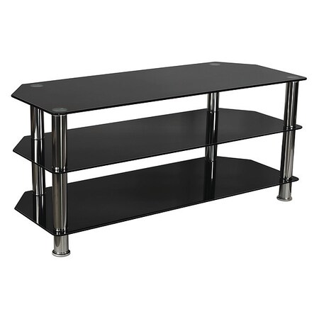 - BLACK TV STANDS - Black tempered glass and shiny chrome legs for modern and contemporary look.