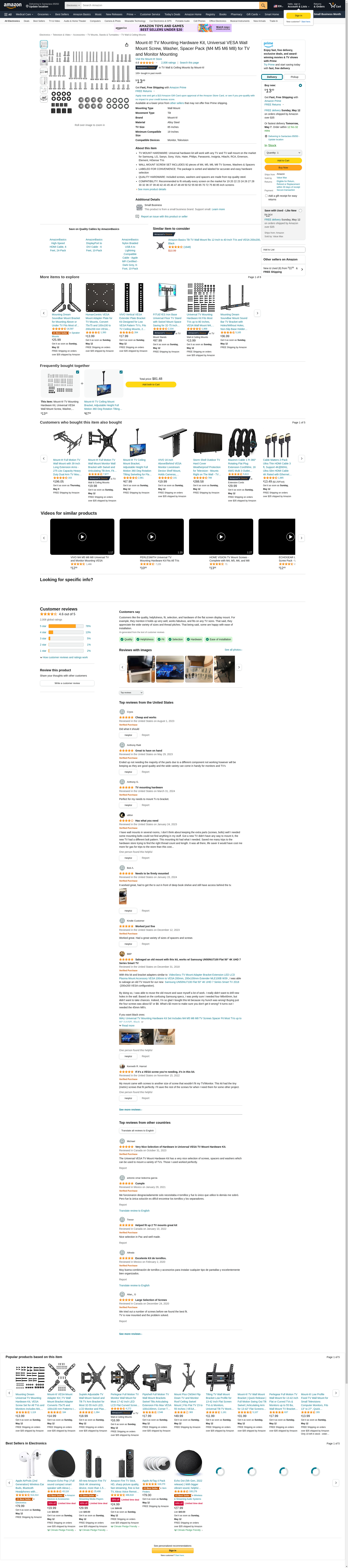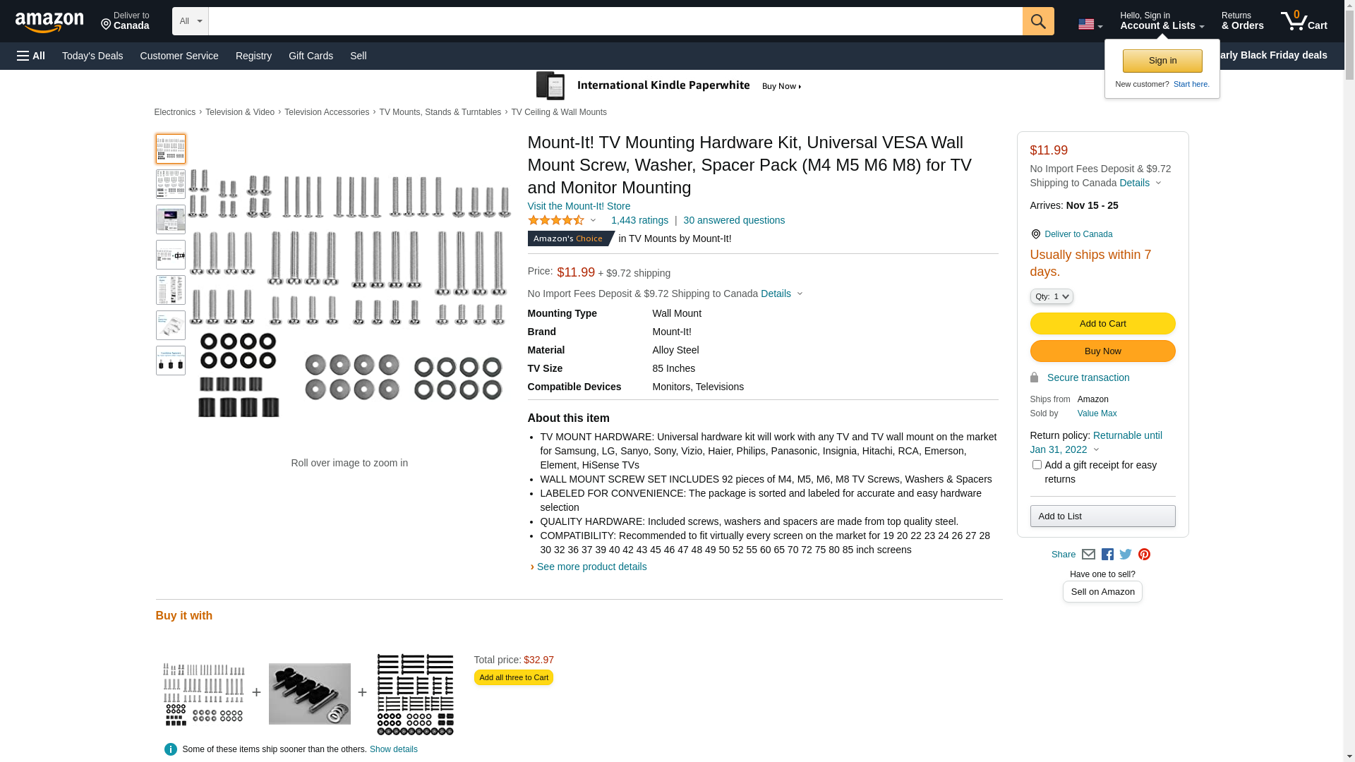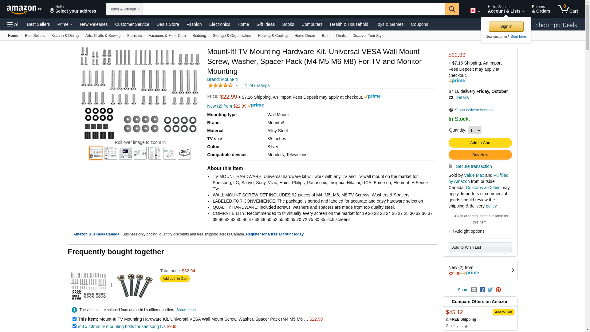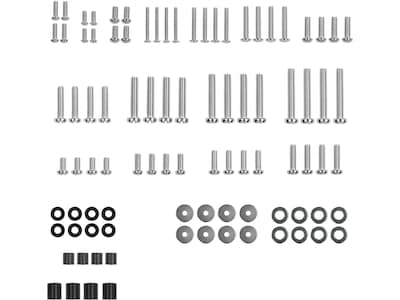 Mount-It! TV Mounting Hardware Kit MI-TVHWKIT Most TV mounts come with bolt and spacer kits that match typical TVs on the market. If your TV requires special bolts with different size and length requirements you will need to search all over the hardware store to find the right size. Mount-It! TV hardware kit solves the problem for you with a complete kit totaling 92 pieces that works with all the TV models and brands on the market. It even includes less common bolts specifically for Samsung TVs. M4 12mm, 35mm X4 pieces M5 12mm, 35mm X4 pieces M6 12mm, 20mm, 35mm X4 pieces M8 16mm, 20mm, 25mm X4 pieces M8 30mm, 35mm X4 pieces M8 50mm, 40mm, 45mm X4 pieces M4/M5 Washers: 8 pieces; 2.5mm Spacers: 8 pieces M6/M8 Washers: 8 pieces; 22mm Spacers: 4 pieces