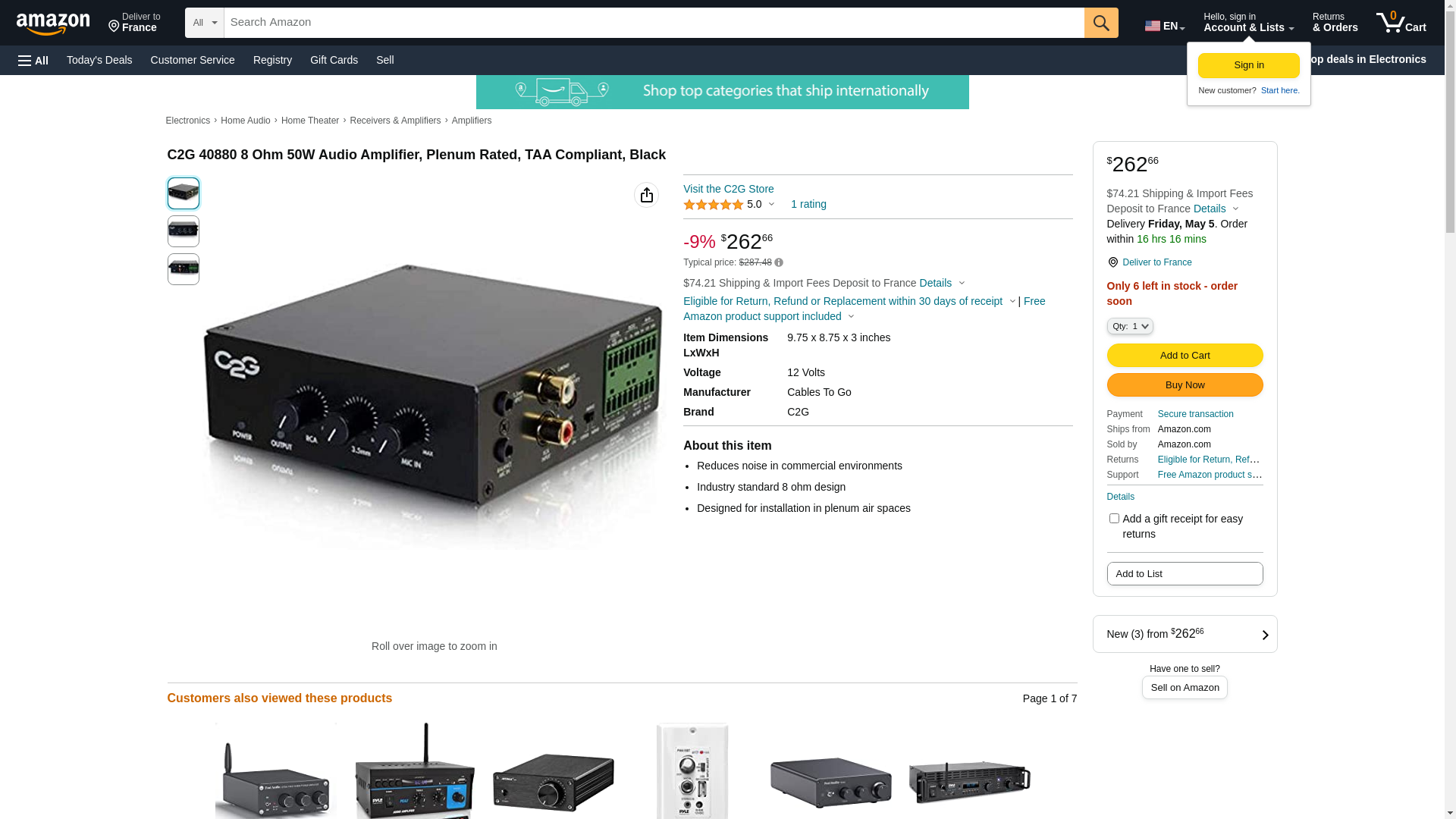 C2G/Cables to Go 40880 8 Ohm 50W Audio Amplifier, Plenum Rated, TAA Compliant
