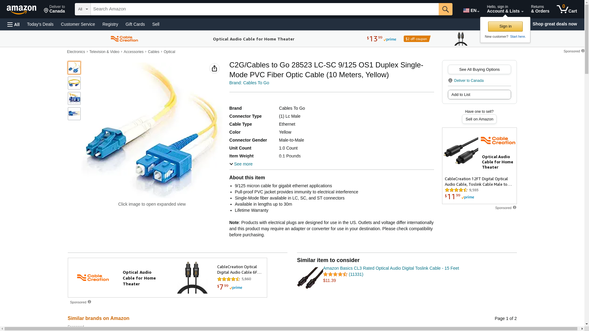 C2G / Cables To Go 28523 LC-SC 9/125 OS1 Duplex Single-Mode PVC Fiber Optic Cable (10 Meters, Yellow). 9/125 micron c...