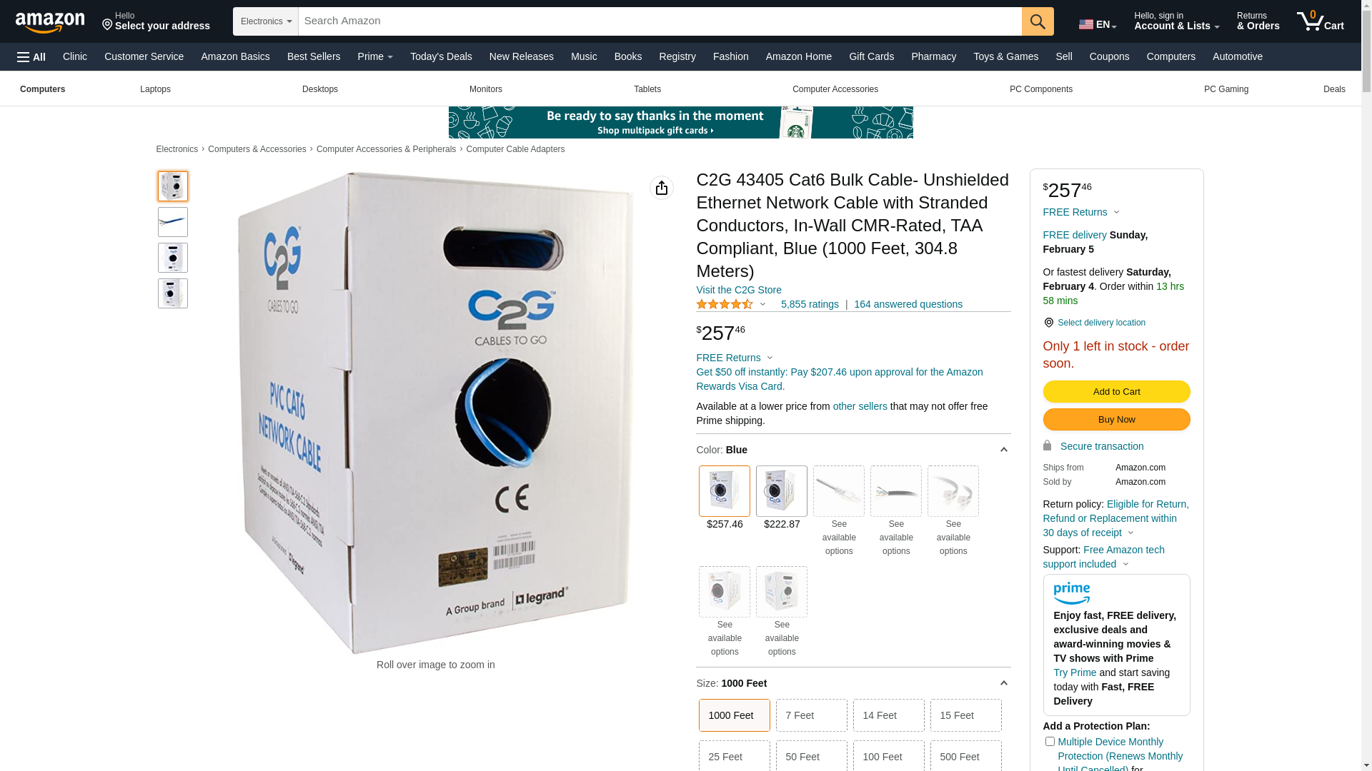 C2G 43405 Cat6 Bulk Cable- Unshielded Ethernet Network Cable with Stranded Conductors, In-Wall CMR-Rated, TAA Compliant, Blue (1000 Feet, 304.8 Meters)