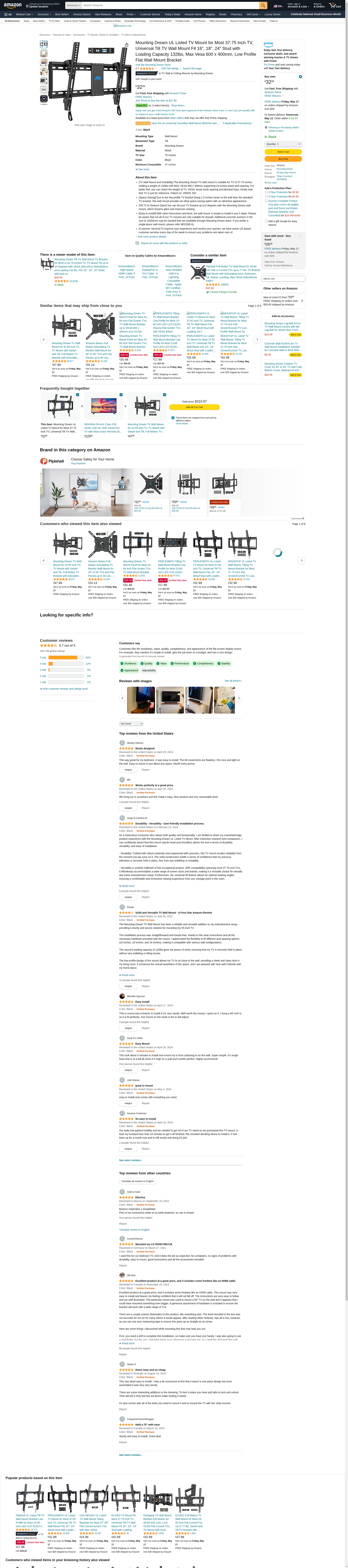 | Feature | Fits most 37-70" TVs up to 132 LBS, with max VESA/mounting holes spacing of 600 x 400mm. Our mounts are tested 4 times loading weight claimed. Images on left side will help you see if this mount perfectly fits your TV in the aspects: VESA, studs spacing and possible blocked input. If not perfect, you can check other Mounting Dream mounts for BEST options. |