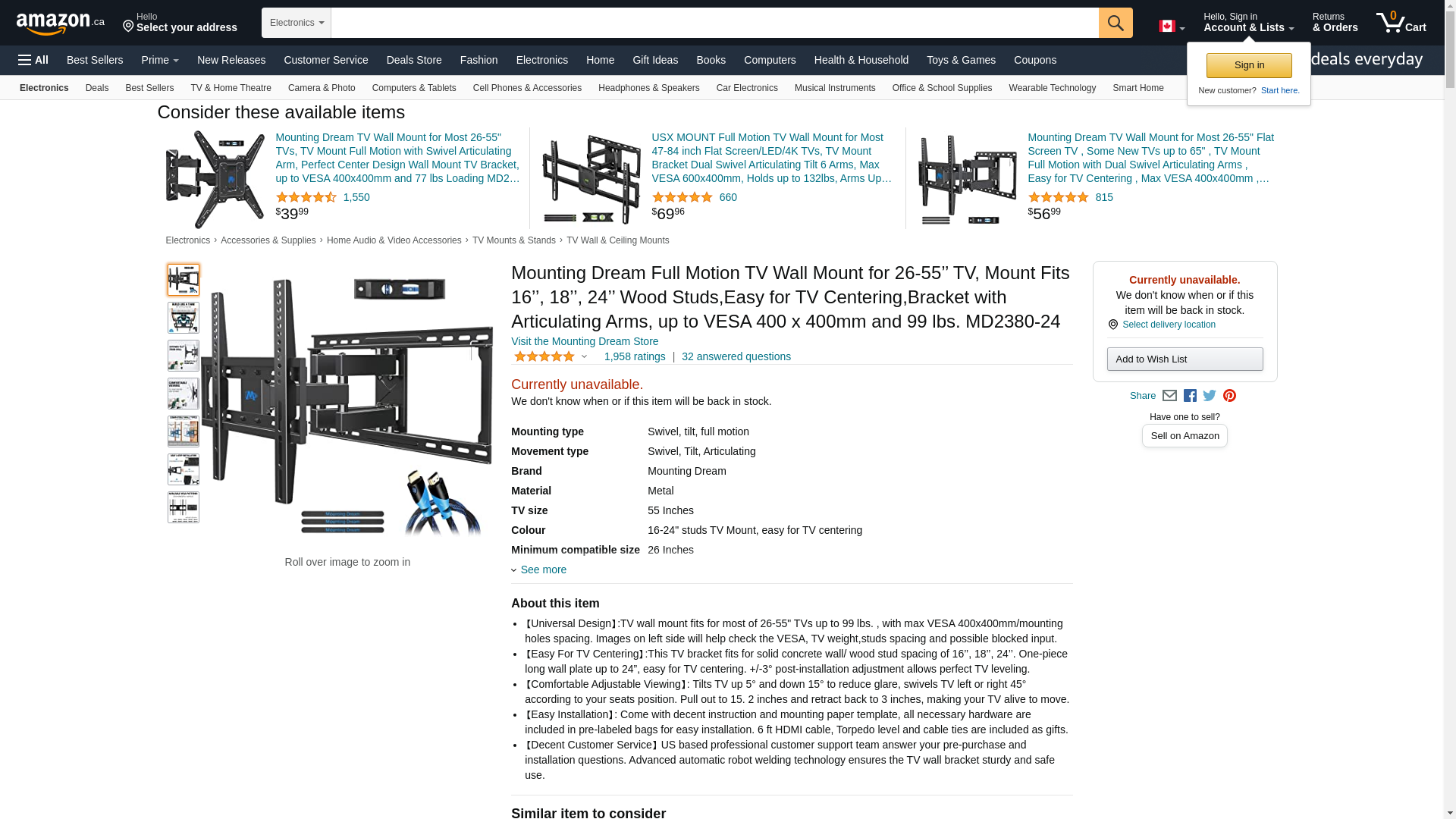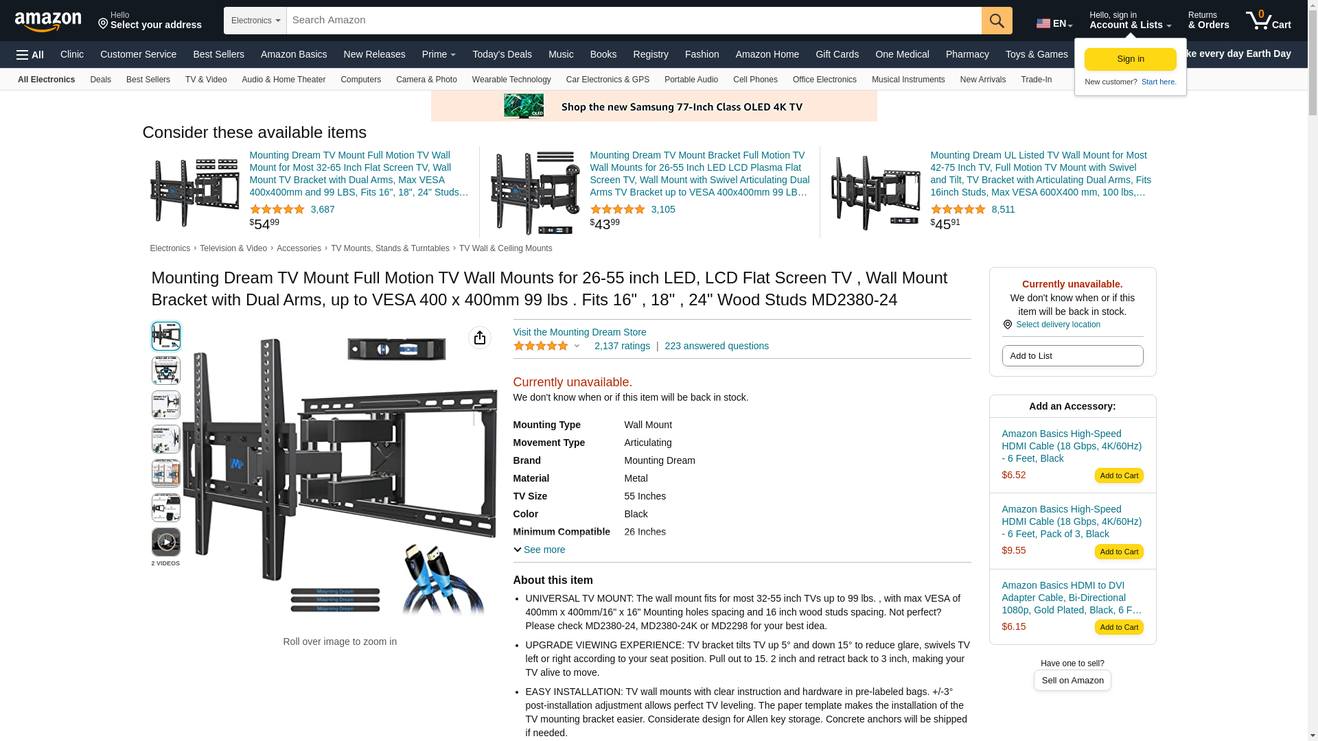Mounting Dream TV Mount Full Motion TV Wall Mounts for 26-55 inch LED, LCD Flat Screen TV , Wall Mount Bracket with Dual Arms, up to VESA 400 x 400mm 99 lbs . Fits 16" , 18" , 24" Wood Studs MD2380-24