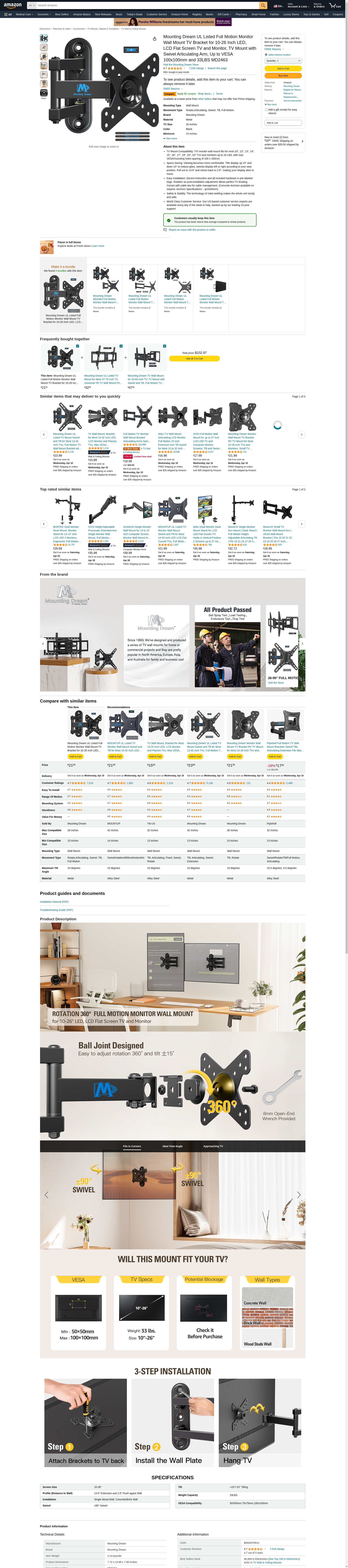 Mounting Dream UL Listed Full Motion Monitor Wall Mount TV Bracket for 10-26 Inch LED, LCD Flat Screen TV and Monitor, TV Mount with Swivel Articulating Arm, Up to VESA 100x100mm and 33LBS MD2463