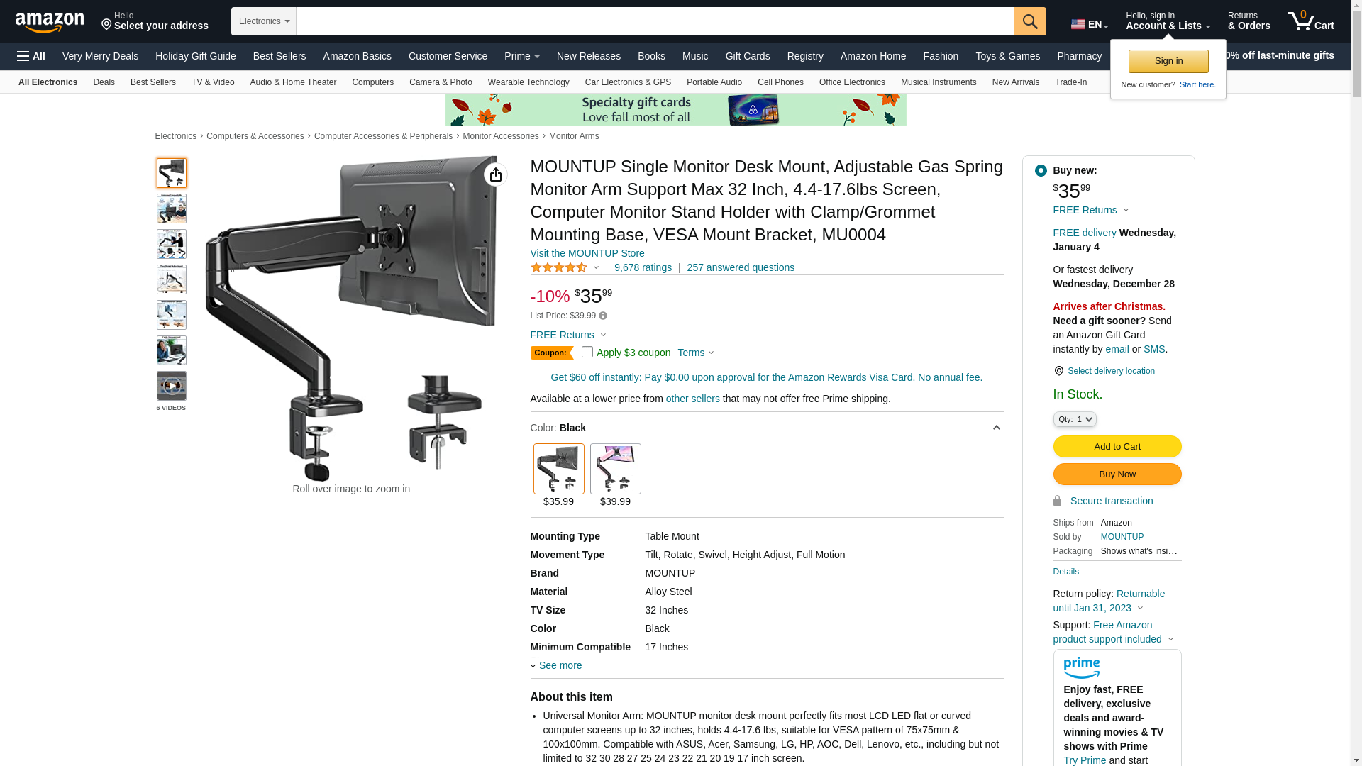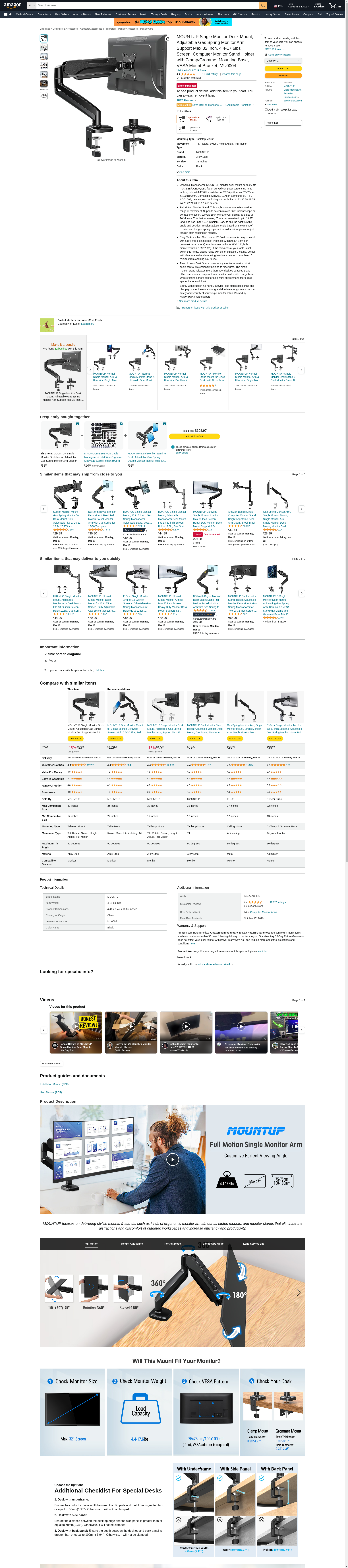 MOUNTUP is the manufacturer of high-quality monitor stands and TV mounts at the best prices. Each product is sleekly designed, and rigorously tested for durability, and assembly instructions have been standardized for simplicity from start to finish. Our monitor arm series build robust and are constructed for ultimate versatility. They are not only promoting a clutter-free workspace but also support a more ergonomic working posture.<br><br> UNIVERSAL COMPATIBILITY<br> Our monitor desk mount perfectly fits most LCD LED flat screens and computer monitors up to 32 inches, 17.6 lbs, compatible with VESA patterns of 75x75mm and 100x100mm. <br><br> COMPLETE RANGE OF MOTION<br> It pivots, it swivels, it swings. The full-motion articulating arm is easy to move the screen to various angles and locations. The control of the arm is smooth.<br><br> 2 MOUNTING OPTIONS<br> Easy set up on the edge of your desk using a C-clamp or in grommet eyelet. We offer a user manual and all the necessary hardware to install.<br><br> STURDY CONSTRUCTION<br> Heavy duty reliable desk stand made from steel securely holds monitor stable in any position. The clamping feet are wide in diameter which prevents slippage.<br><br> SPECIFICATION<br> Fit Screen Size: max 32"<br> Load Capacity: 4.4-17.6lbs<br> VESA Pattern: 75x75mm/100x100mm<br> Screen Tilt: -45° to +90°<br> Arm Swivel: -180° to +180°<br> Screen Swivel: -90° to +90°<br> Screen Rotation: 360°<br>