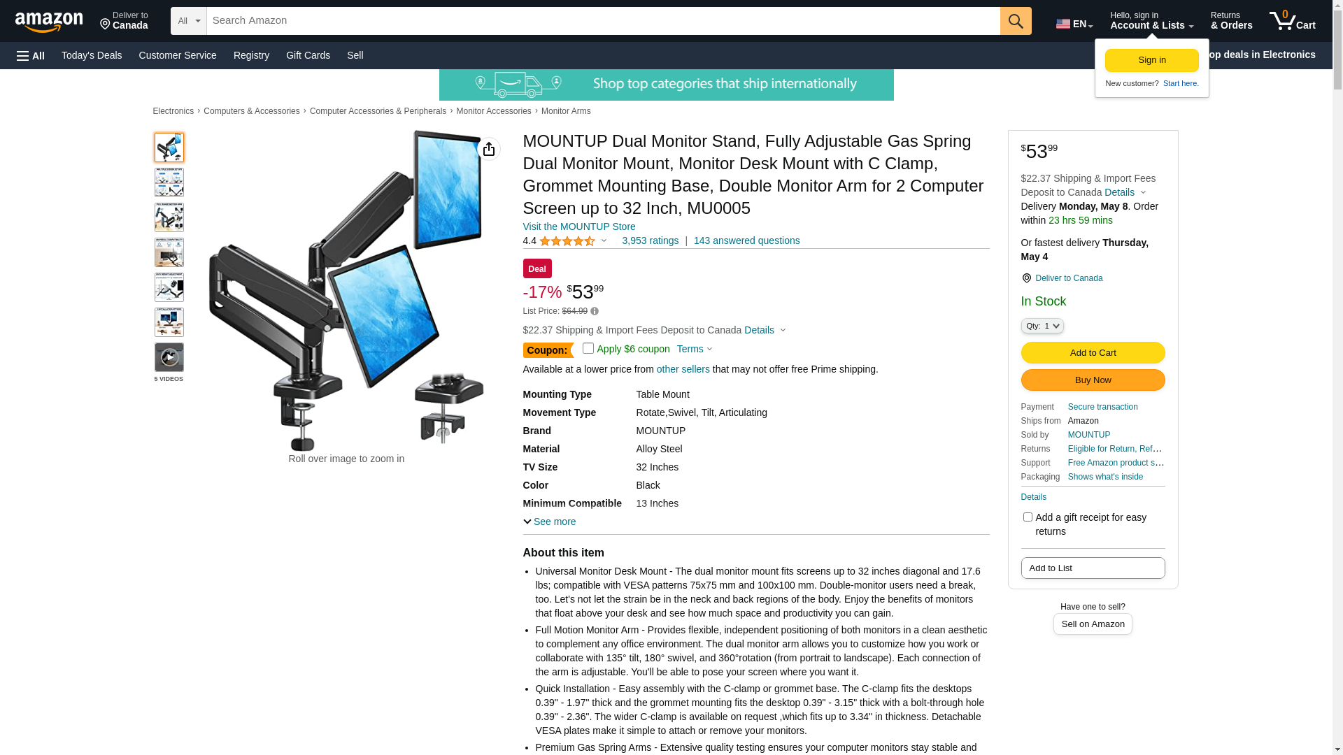 We are manufacturer of high-quality monitor stands. Each product is sleekly designed, and rigorously tested for durability, and assembly instructions have been standardized for simplicity from start to finish. Our monitor arm series build robust and are constructed for ultimate versatility.<br><br> MOUNTUP dual monitor arms are the life changer for someone who needs to be using at least 2 monitors and sits at the desk staring at a screen a lot. They are not only promoting a clutter-free workspace, but they also support a more ergonomic working posture.<br><br> GAS SPRING SYSTEM<br> Please adjust arm tension according to the weight of the monitor. It's easy to raise or lower your display. The monitor mount provides a 9.4" height adjustment range and extension up to 19.8" for each arm. Turn clockwise to reduce tension for lighter monitors and turn counter-clockwise to increase tension for heavier monitors.<br><br> COMPLETE RANGE OF MOTION<br> Not only it provides height adjustment, but it also pivots, swivels, it swings. The full-motion articulating arms are easy to move the screen to various angles and locations that give you the flexibility of various screen combinations.<br> - Swivel monitor 180°to show display to clients or colleagues.<br> - Tilt monitor 90°up and 45°down to find a more comfortable viewing.<br> - Pivot monitor 180°to shift between portrait and landscape with ease.<br><br> SPECIFICATION<br> Fit Screen Size: max 32"<br> Each Arm Load Capacity: 4.4lbs - 17.6lbs <br> VESA Pattern: 75x75mm/100x100mm<br> Arm Swivel: -180° to +180°<br> Screen Swivel: -90° to +90°<br> Screen Rotation: 360°<br> Gas Spring Adjustment Range: 9.4"<br>