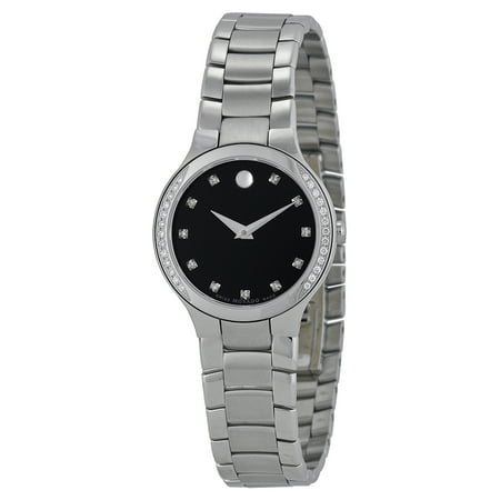 Stainless steel case with a stainless steel bracelet. Fixed stainless steel with 26 diamonds bezel. Black dial with silver-tone hands and diamond hour markers. Dial Type: Analog. Quartz movement. Scratch resistant sapphire crystal. Pull / push crown. Solid case back. Case diameter: 28 mm. Case thickness: 6.1 mm. Round case shape. Deployment with push button clasp. Water resistant at 30 meters / 100 feet. Functions: hour, minute. Dress watch style. Watch label: Swiss Made. Movado Serio Diamond Museum Dial Ladies Watch 0606491.