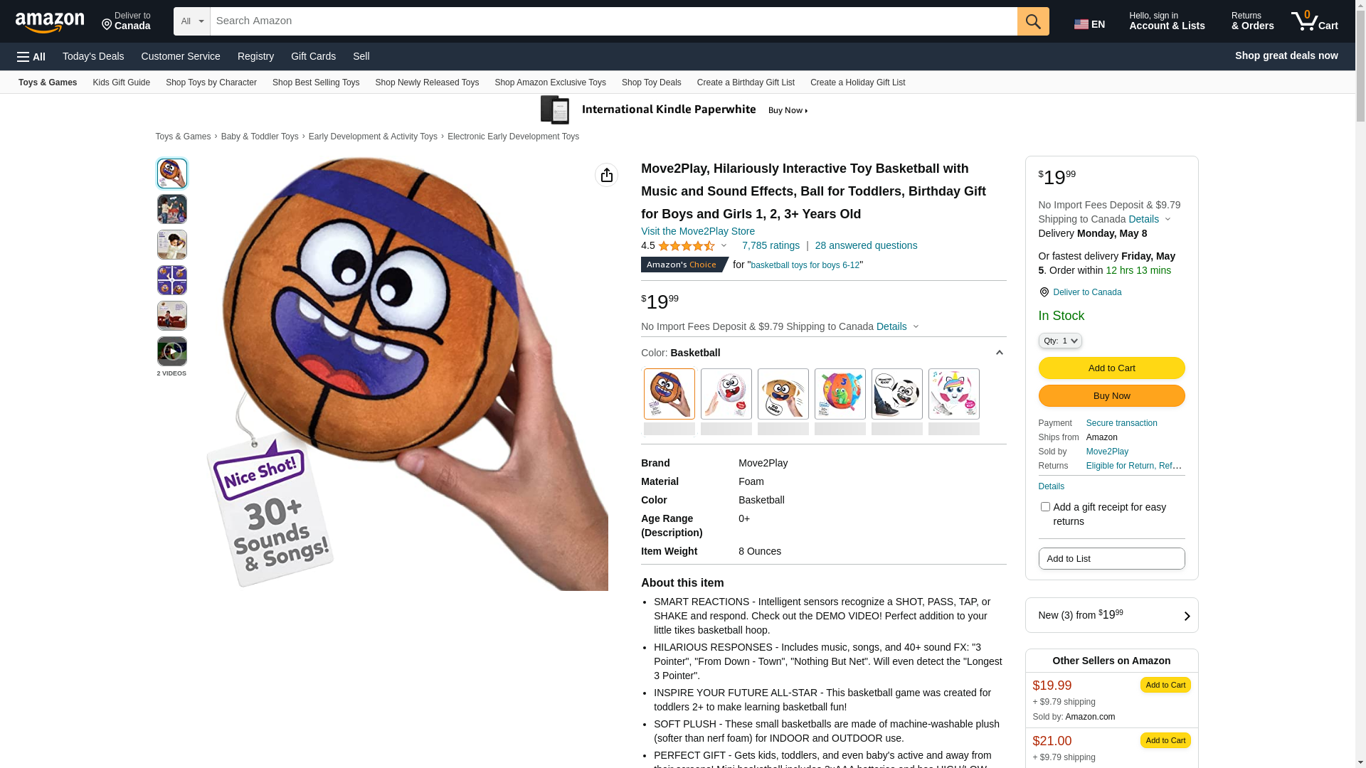 Move2Play, Hilariously Interactive Toy Basketball with Music and Sound Effects, Ball for Toddlers, Birthday Gift for Boys and Girls 1, 2, 3+ Years Old