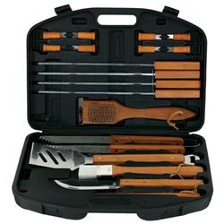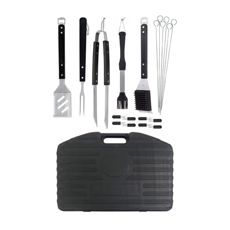 - Set includes: 20-in-1 spatula, tongs, 6 skewers, fork, silicone basting brush, grill brush, 8 corn holders and carrying case.