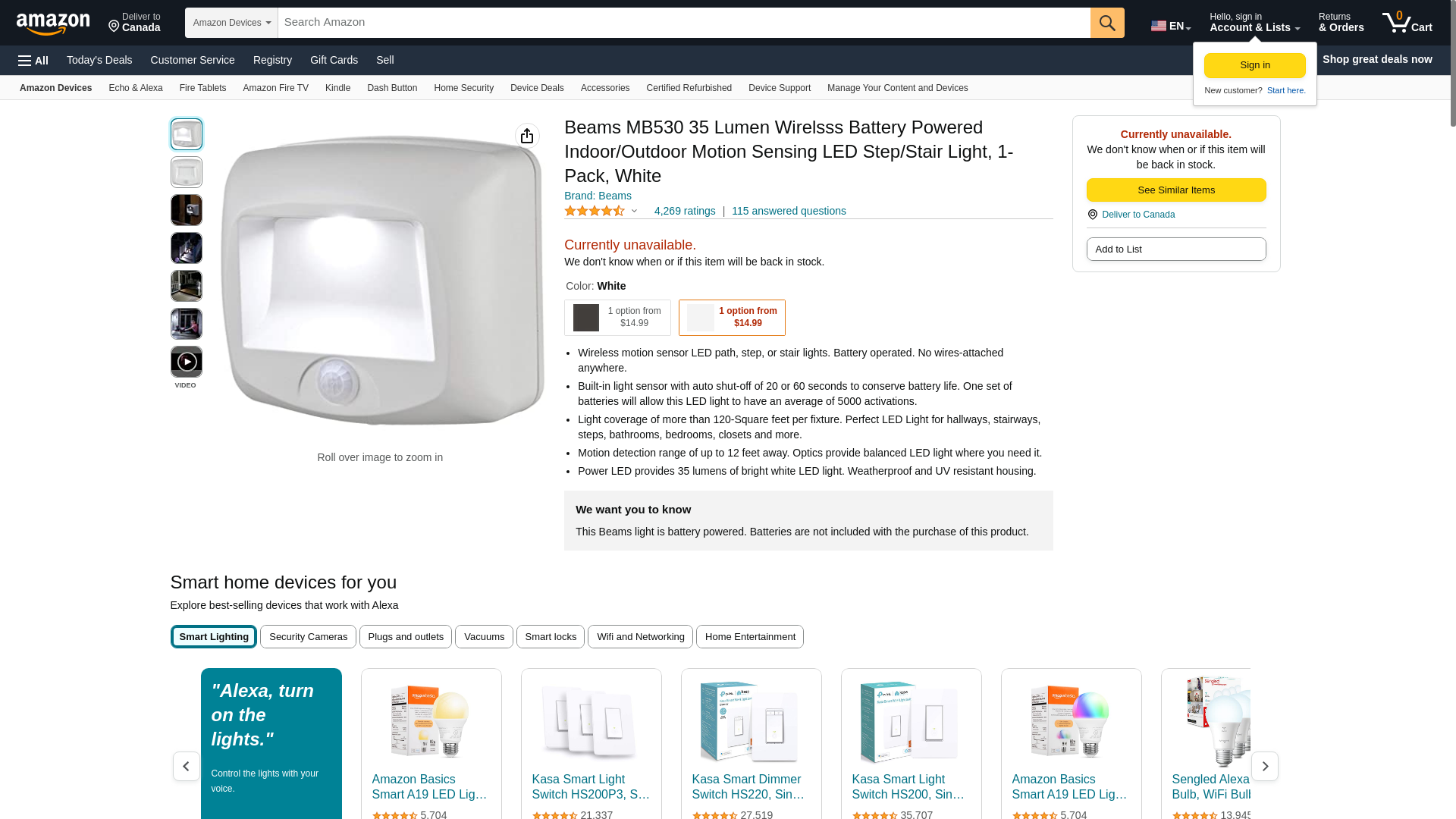 - Motion Sensor: ○; Auto Shut: 20 seconds / 30 seconds / Night light after light; Waterproof: Yes (IPX4); Rated Luminous Flux: 35 lumens; Battery: 3 x AA batteries (sold separately)