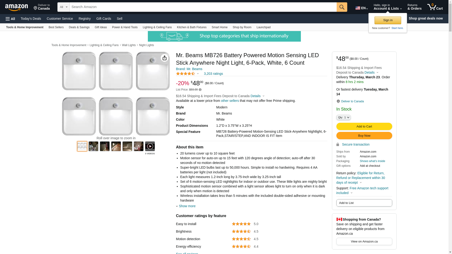 | Feature | Set of 6 motion-sensing LED nightlights for indoor or outdoor use. These little lights are mighty bright |