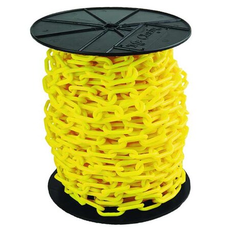 - Price For: Each Finish: Gloss Item: Plastic Chain Material: Polyethylene Size: 2" Length: 125 ft. Color: Yellow Application: Outdoor or Indoor Country of Origin (subject to change): United States