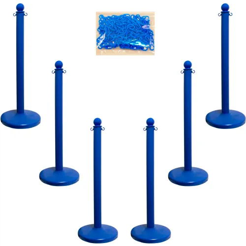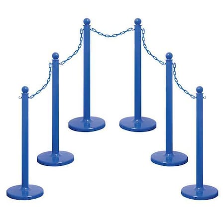 Medium Duty Stanchion and Chain Kit, Application Outdoor or Indoor, Post Dia. 2 1/2 in, Height 40 in, Color Blue, Post Material UV Inhibited Polyethylene, Base Dia. 14 in, Base Material High Density Polyethylene, Post Finish Matte, Finish Plastic, Base Type Flat, Includes Ball Top,6 Stations, C-Hook and 50 ft of chain, Fillable Yes
