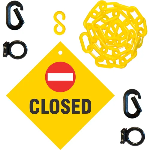 - Includes 1- Closed Sign, 2 magnet rings, 2 carabiners, and 6 feet of 2-inch yellow plastic chain