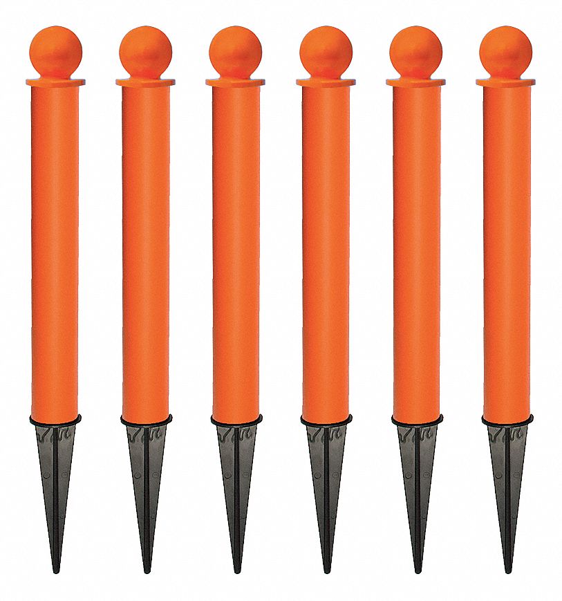 Ground Post, Post Dia. 2 1/2 in, Height 35 in, Color Orange, Post Material Polyethylene, Base Dia. 14 1/2 in, Base Material Plastic, Post Finish Non-Reflective, Finish Gloss, Base Type Stake, For Use With 1.5 in and 2 in Plastic Chain, Includes Ball Top and C-Hook, Fillable No, Package Quantity 6
