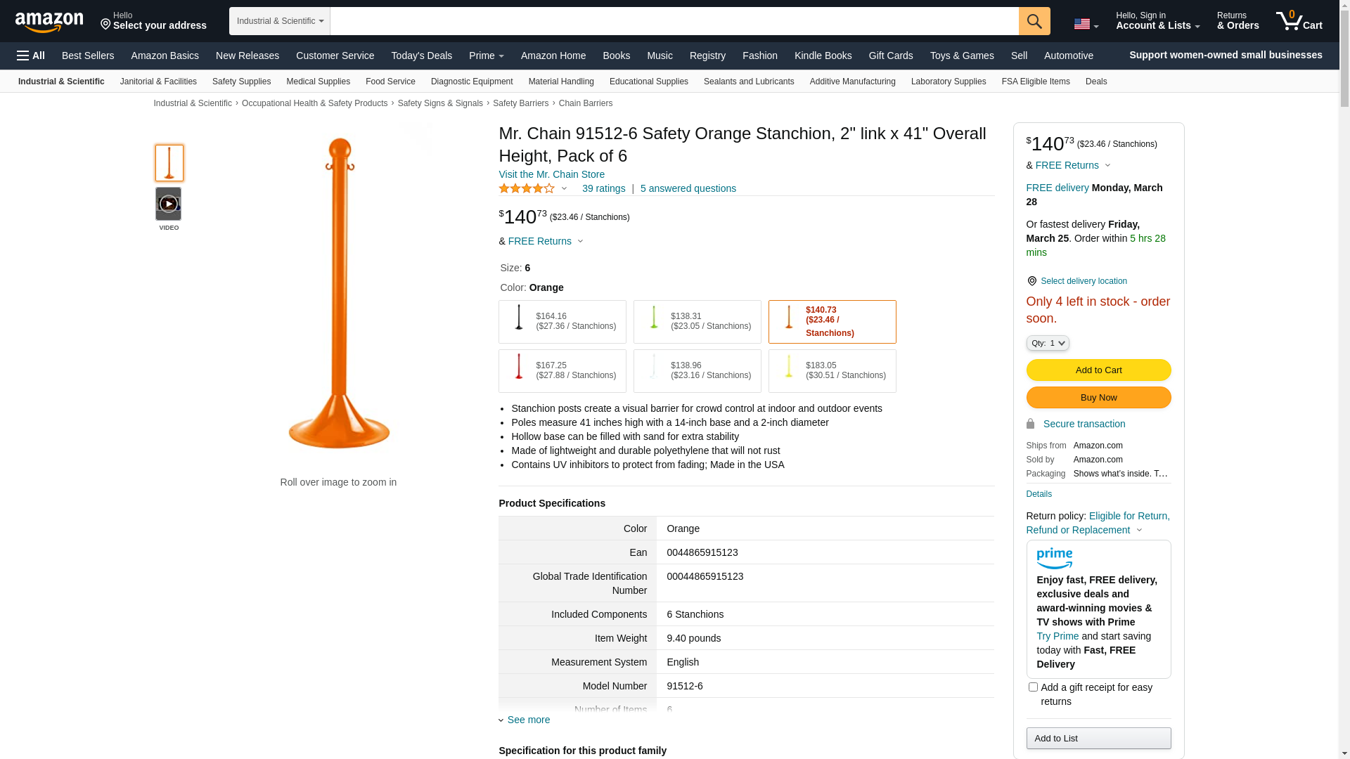 Mr. Chain 91512-6 Safety Orange Stanchion, 2" link x 41" Overall Height, Pack of 6