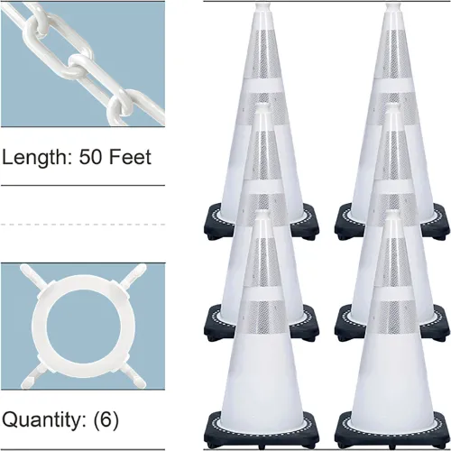 Mr. Chain 28" Reflective Traffic Cone & Chain Kit, 2" x 50'L Chain, PVC, OSHA, White, Pack of 6