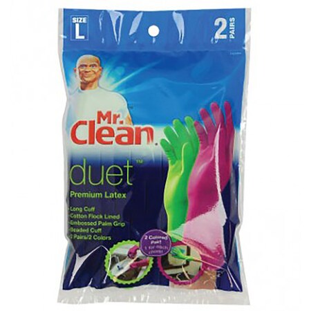 These versatile gloves are ideal for everything from washing dishes to painting walls, in bold colors that make nearly any task a little more exciting. These gloves are crafted with rugged latex materials and feature a soft lining for comfortable wear during use. The palm is textured to provide a no-slip grip for safety. The cuffs are long to cover an extended area of the arm, for an ample, effective barrier between skin and liquids.; ; Brand Name: Mr. Clean Sub Brand: Duet Gender: Unisex Indoor or Outdoor: Indoor/Outdoor Product Type: Cleaning Gloves Color: Assorted Size: L Number in Package: 2 pk Cut Resistant: No Safety Cuff: Yes Breathable: No ANSI Certified: No Lined: Yes Thumb Patch: No Packaging Type: Bagged Nonslip Grip: Yes Material: Latex Reinforced Palm: No Machine Washable: No Leather Palm: No Heat Resistant: No Insulated: No Water Resistant: Yes Knuckle Strap Protection: No