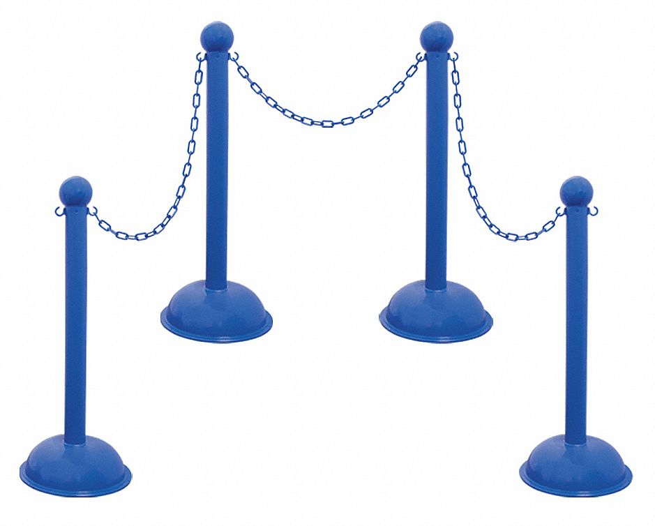 Heavy Duty Stanchion and Chain Kit, Application Outdoor or Indoor, Post Dia. 3 in, Height 41 in, Color Blue, Post Material UV Inhibited Polyethylene, Base Dia. 16 in, Base Material High Density Polyethylene, Post Finish Matte, Finish Plastic, Base Type Dome, Includes Ball Top, C-Hook and 30 ft of chain, Fillable Yes
