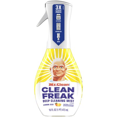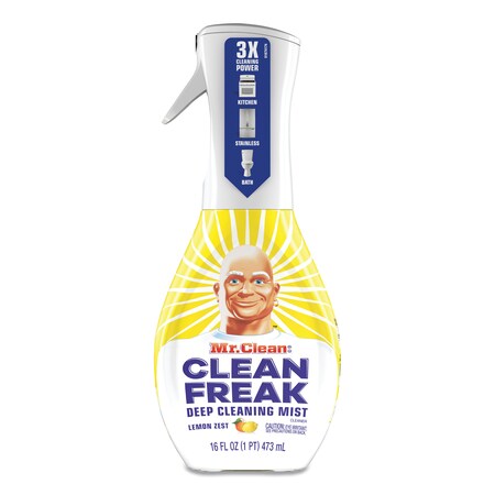 Better than traditional cleaning sprays, Clean Freak Mist muscles through grime, tough dirt and grease to make messes a distant memory. Use it from any angle to put hard-to-reach dirt away for good. And to top it all off, it leaves your home smelling great with a Gain original scent. Rinse surfaces that contact food directly Always test on a small area before use. Safe on granite, chrome, aluminum, marble, nickel or finished wood if wiped dry immediately. Not recommended for copper, untreated wood or brass surfaces.; ; Brand Name: Mr. Clean Sub Brand: Clean Freak Scent: Lemon Zest Product Type: Deep Cleaning Mist Product Form: Liquid Container Size: 16 oz Packaging Type: Trigger Spray Bottle Contains Bleach: Yes
