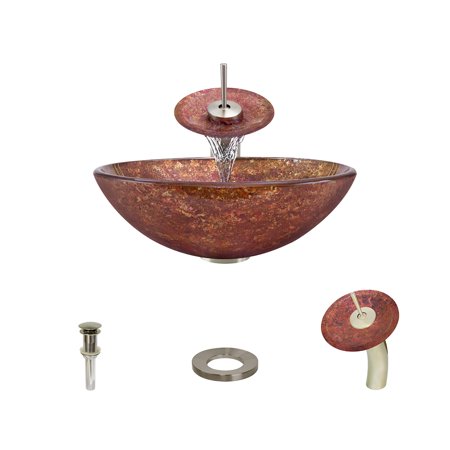 <ul> <li>CONTEMPORARY STYLING Embedded foils of gold and brown are heavily sprinkled over with magenta glitter, creating a variegated pattern of dazzling blended colors</li> <li>DISTINCTIVE INSTALLATION Resting on the vanity, the glass vessel sink draws attention as a work of art as well as a functional element of the bath; the brilliance of glass is something to behold</li> <li>INHERENT DURABILITY Tempered glass, tough and thick, offers a strong, hygienic, non-porous surface; stain-resistant, heat-resistant, and odor-resistant</li> <li>GUARANTEED QUALITY A Lifetime Warranty covers the sink, and a One-Year Warranty covers all accessories</li> </ul>