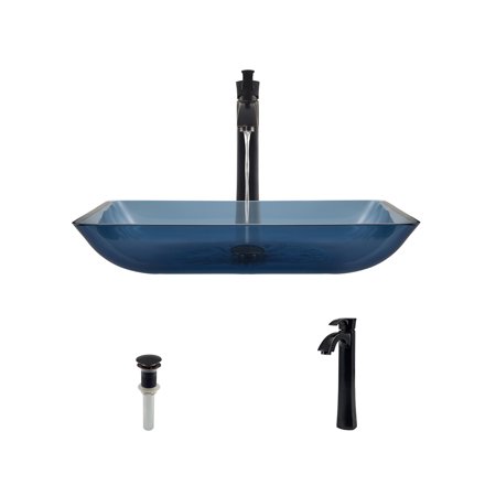 | Feature | CONTEMPORARY STYLING - Sky blue glass glistens throughout this rectangular shaped vessel with its broad flat bottom and sides arching upwards in a 45-degree curve|DISTINCTIVE INSTALLATION - Resting on the vanity, the glass vessel sink draws attention as a work of art as well as a functional element of the bath; the brilliance of glass is something to behold|INHERENT DURABILITY - Tempered glass, tough and thick, offers a strong, hygienic, non-porous surface; stain-resistant, heat-resistant, and odor-resistant| D QUALITY - A Lifetime covers the sink, and a One-Year covers all accessories |