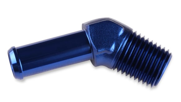 NPT to Hose Barb Fitting, (1) 3/8 in. NPT Male Port, (1) 1/2 in. I.D. Barb , 45 Degree Angle, 6061 Aluminum, Satin Blue Anodized Finish