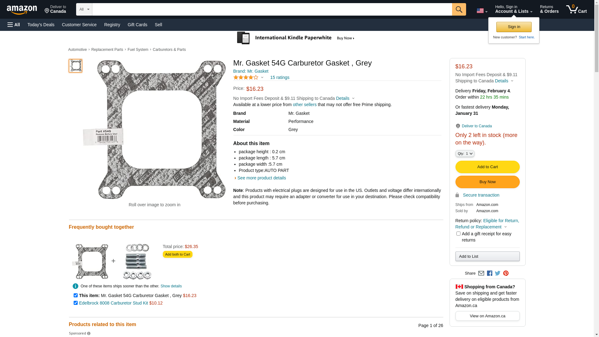 ![]() automotivestuff.com | MRGASKET-54G | 1 | -2 | 1 | 1 @ $19.26 |