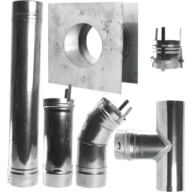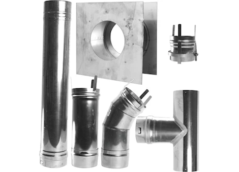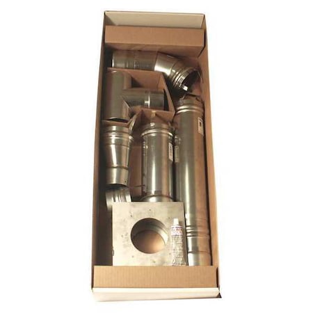 - F102860 Features: -All parts for complete venting. -Adjustable elbow. Product Type: -Vent kit/Diffuser. Material: -Metal. Number of Items Included: -9. Pieces Included: -adapter, b-vent pipe, 2 vent pipes, 90 degree elbow, wall thimble, roof flashing, storm collar, vent cap. Dimensions: -The thimble for through the wall use can expand about 4. Overall Height - Top to Bottom: -6.5". Overall Width - Side to Side: -13.5". Overall Depth - Front to Back: -37". Overall Product Weight: -13 lbs."