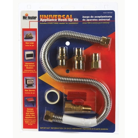 MR. HEATER 22 Inch Universal Gas Appliance Connection Kit, F271239, One Stop Universal Gas Connection Kit, Has Everything Needed for Installation and Can Be Used with Gas Logs, Ventless Wall Mount Heaters, Stoves gas and garage heaters. 5 PIECE KIT COMPLETE GAS CONNECTOR FOR MOST GAS APPLIANCES. Includes 22-inch flexible stainless steel hose attached to a brass shut-off valve 1/2-inch female pipe thread with 1/2-inch male flare. The kit also includes gas sealing tape and the following adapter parts: 1/2" MALE FLARE /2" MALE FLARE X 3/8" FEMALE TUBE.