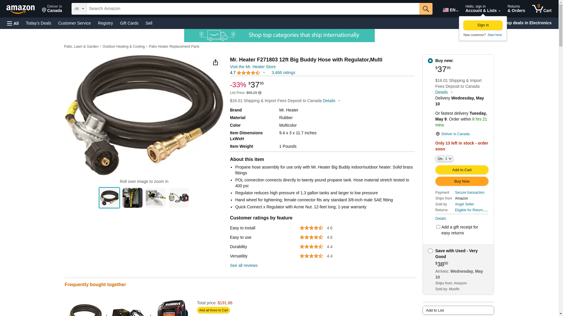 | Feature | Propane hose assembly for use only with Mr. Heater Big Buddy indoor/outdoor heater. Solid brass fittings |