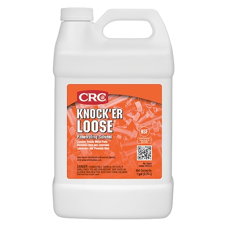 ' Penetrating Solvent, Knocker Loose(R), Size 1 Gal, Flash Point 126 F, VOC Content 369.9 g/L, Specific Gravity 0.84, Film Type Non-Drying Oil, Dielectric Strength 50, 300, None Propellant, Low Viscosity, Non-Drying, VOC Compliant, Nuts and Bolts, Pins, Screws, Bushings, Clips, Hinges, Snaps, Lugs, Caps, Locks, Washers and Sliding Mechanisms., Petroleum Base, NSF H2 Registered '