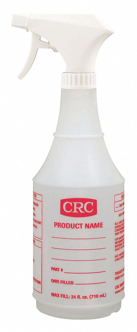 24 oz bottle features volume measurements as well as blank lines and boxes where the user can add their own product and safety information.; ; Brand Name: CRC Container Size: 24 oz Product Type: Spray Bottle Bottle Color: Clear Number in Package: 1 pk