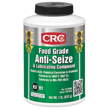 Food Grade Anti-Seize, Aluminum Base Composition, Min. Operating Temp. -65 Degrees F, Max. Operating Temp. 1800 Degrees F, Lubricant Color White, NSF Rating H1 Food Grade, Lubricant Container Brush-Top Can, Container Size 16 oz., Lubricant Additives Zinc, Physical Form Paste, Net Weight 16 oz., Specific Gravity 1.17, VOC Content 0 Percent, Flash Point 400 Degrees F, Standards MIL-PRF-907E, RoHS Compliant