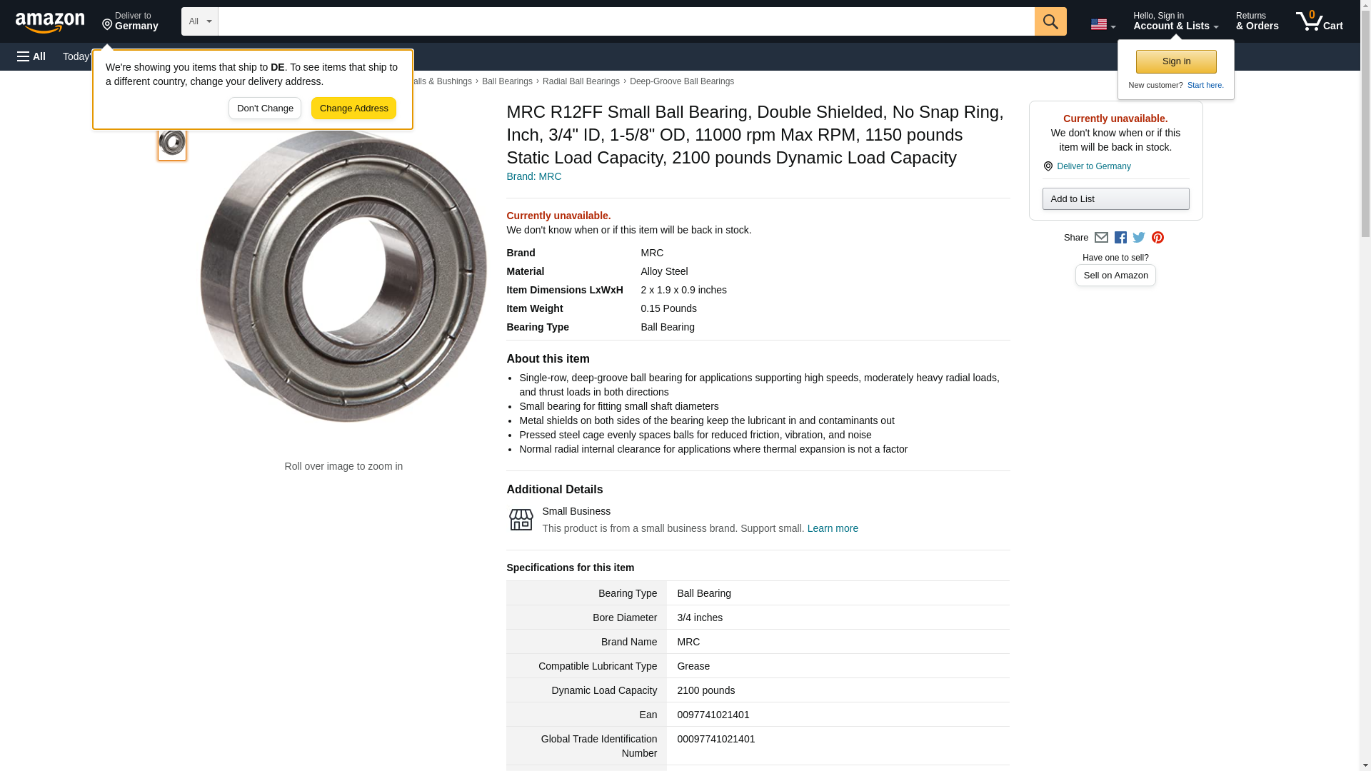 <p><b>Specification: </b><ul><li>Item: Radial Ball Bearing</li><li>Unmounted Bearing Item: Radial Ball Bearing</li><li>Single Row/Double Row: Single Row</li><li>Seal/Shield Type: Double Shielded</li><li>Bore Dia.: 0.7500"</li><li>Bore Tolerance: +.005/-.005mm</li><li>Outside Dia.: 1.6250"</li><li>Outside Dia. Tolerance: -.008/-.020mm</li><li>Width: 0.4375"</li><li>Shield Material: Steel</li><li>Retainer Type: Snap Ring</li><li>ABEC Tolerance: 1</li><li>Dynamic Load Capacity: 9360 lb.</li><li>Static Load Capacity: 5100 lb.</li><li>Max. Load Axial: 290 lb.</li><li>Max. RPM: 16,000</li><li>Temp. Range: -22 Degrees to 230 Degrees F</li><li>Bearing Material: Steel</li><li>Cage Material: Pressed Steel</li><li>Lubrication: Grease</li><li>Industry Number: R12FF</li></ul></p>