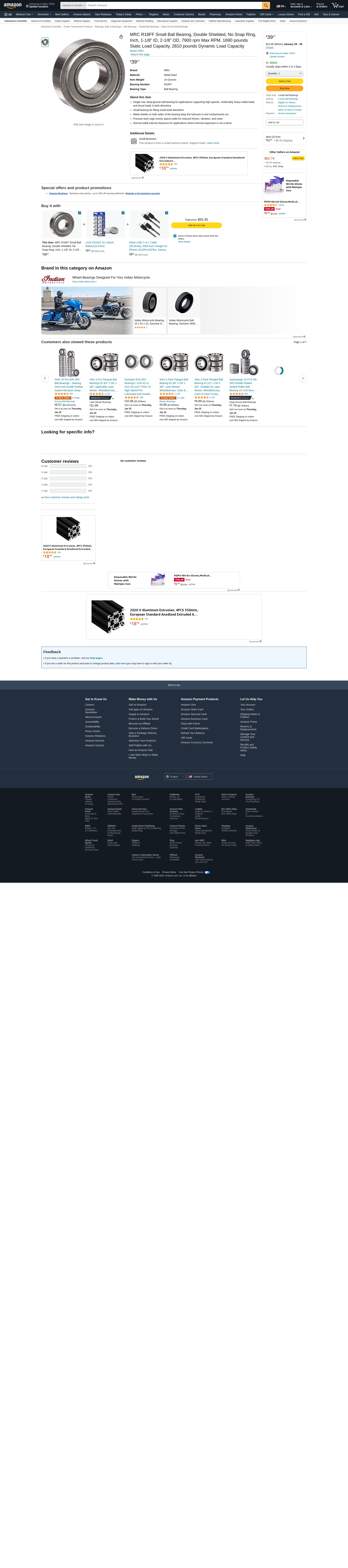 MRC R18FF Small Ball Bearing, Double Shielded, No Snap Ring, Inch, 1-1/8" ID, 2-1/8" OD, 7900 rpm Max RPM, 1690 pounds Static Load Capacity, 2810 pounds Dynamic Load Capacity