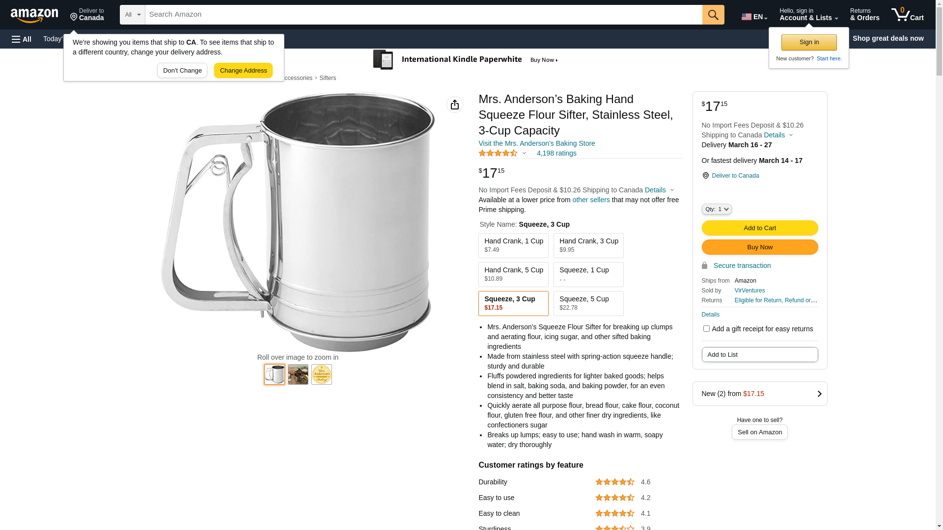 Mrs. Anderson’s Baking Hand Squeeze Flour Sifter, Stainless Steel, 3-Cup Capacity