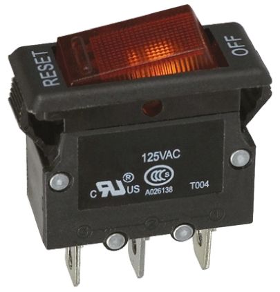 EU RoHS: Compliant with Exemption ECCN (US): EAR99 Part Status: Active HTS: 8536.20.00.40 Type: Thermal Number of Poles: 1 Voltage Rating: 125VAC Current Rating (A): 15 Trip Time: 4s to 40s Actuator Type: Rocker Minimum Operating Temperature (°C): 0 Maximum Operating Temperature (°C): 60 Terminal Design: Quick Connect Mounting: Snap-In|Panel Mount Number of Terminals: 3