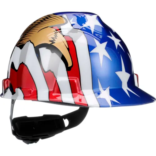 MSA 10052947 Freedom Series V-Gard Cap Style Safety Hard Hat With Fas-Trac III Ratchet Suspension | Polyethylene Shell, Self Adjusting Crown Straps - Standard Size in American Flag W/ Eagle