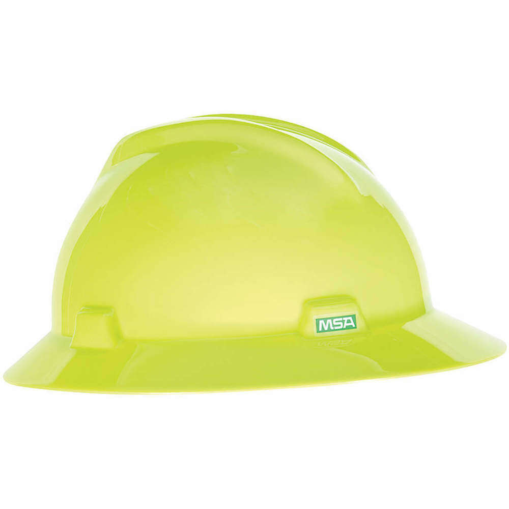 MSA 10061515 V-Gard Full-Brim Hard Hat with Fas-Trac III Ratchet Suspension | Polyethylene Shell, Superior Impact Protection, Self Adjusting Crown Straps - Standard Size in Hi-Viz Yellow-Green