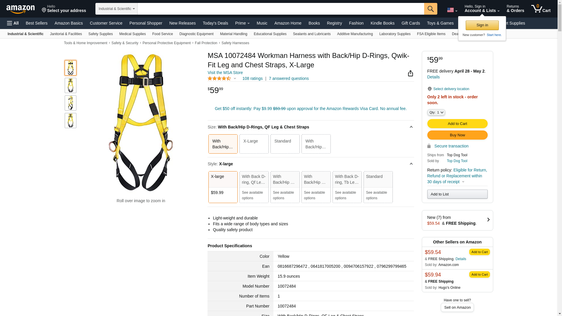 MSA 10072484 Workman Harness with Back/Hip D-Rings, Qwik-Fit Leg and Chest Straps, X-Large