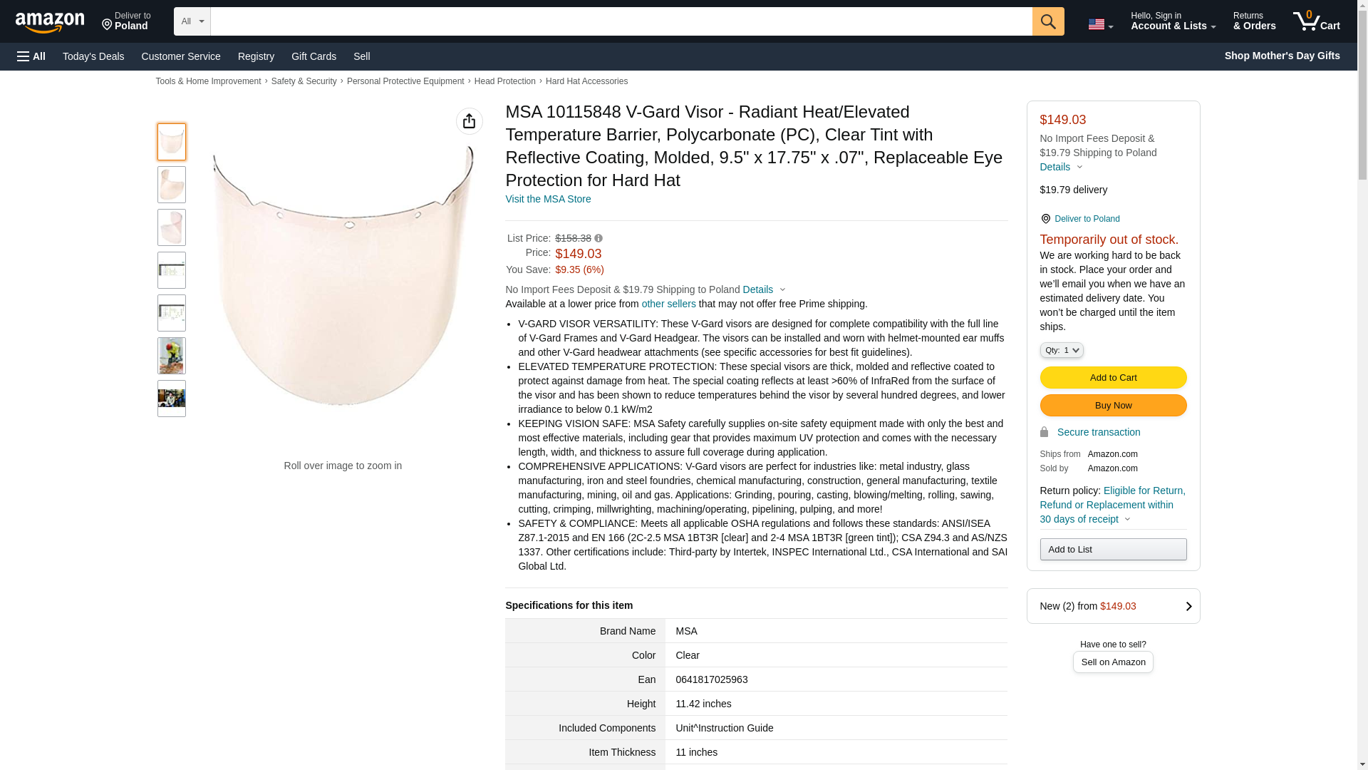 MSA V-Gard 9.5" X 17.75" X .07" Clear Polycarbonate Radiant Heat/Elevated Temperature Visor. Reflective coating reflects IR and helps dissipate heat Thick visor helps prevent warping, cracking or crazing under tough conditions Extended length for greater coverage of face and neck; DO NOT use for welding Clear, reflective-coated Reflects >60% Infrared (IR) radiation (EN166 “R” mark) in the 780nm to 2000nm wavelengths Impact-rated (Z87+) Maximum UV protection (“U6”) Specifications ANSI/ISEA Z87.1-2010 EN 166 (2C-2.5 MSA 1BT3R) CSA Z94.3 AS/NZS 1337
