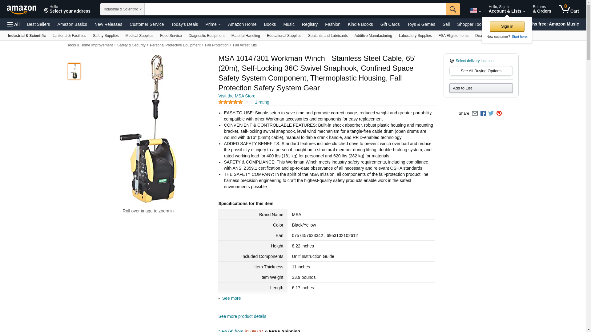 MSA 10147301 Workman Winch - Stainless Steel Cable, 65' (20m), Self-Locking 36C Swivel Snaphook, Confined Space Safety System Component, Thermoplastic Housing, Fall Protection Safety System Gear
