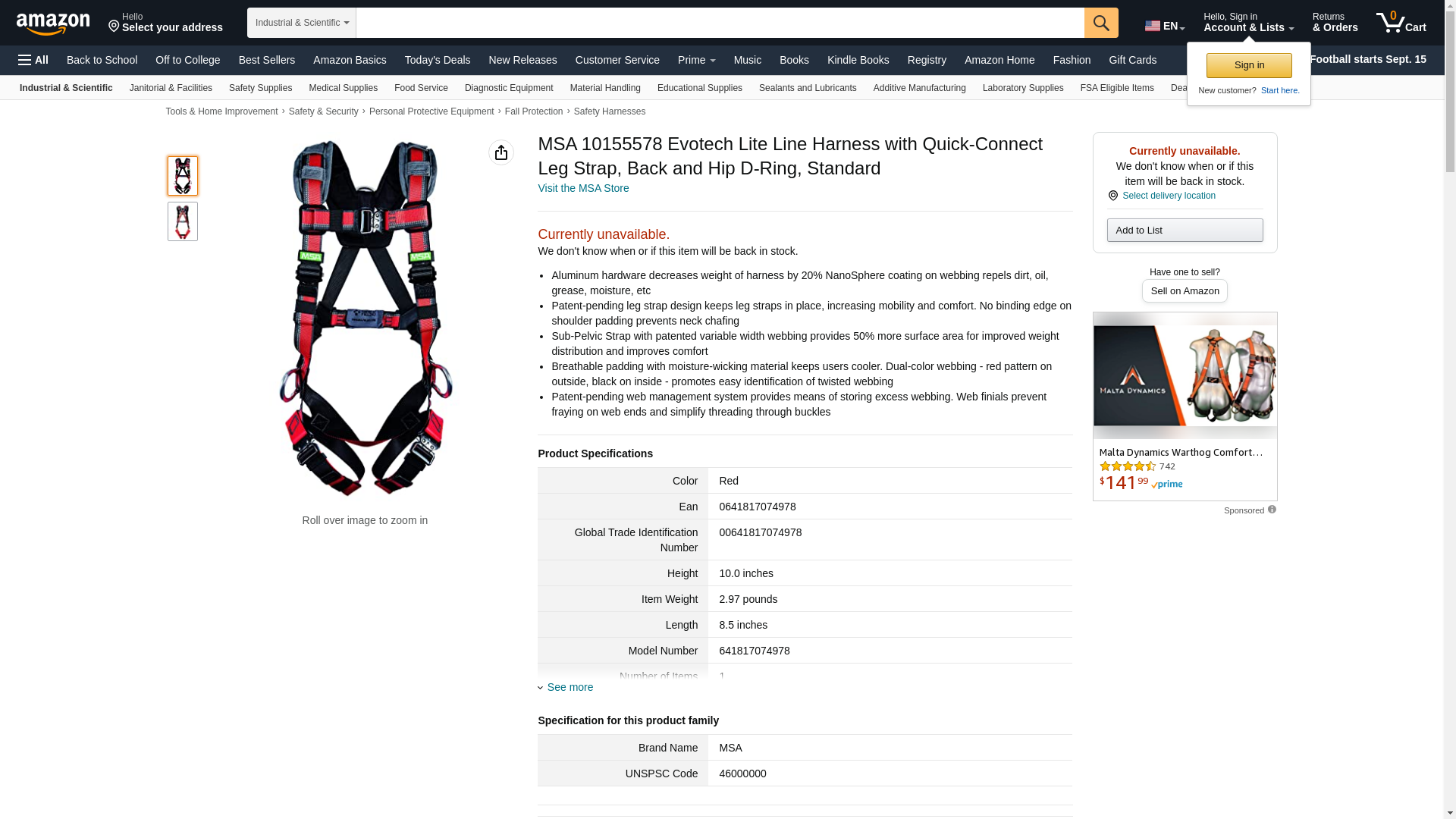 MSA 10155578 Evotech Lite Line Harness, Quick-Connect Leg Strap, Back and Hip D-Ring, Standard Size