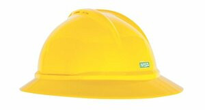 MSA 10167952 V-Gard 500 Full-Brim Hard Hat With 6-Point Fas-Trac III Ratchet Suspension | Polyethylene Shell, Superior Impact Protection, Self Adjusting Crown Straps - Standard Size in Yellow