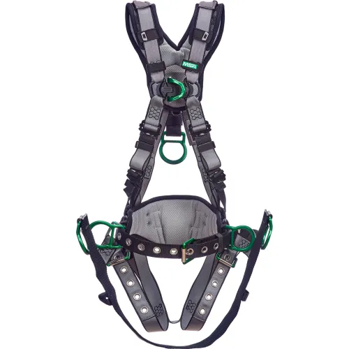 MSA 10195205 V-FIT Derrick Construction Harness - Size: Standard (Medium), D-Ring Configuration: Back/Chest/Hip, Tongue Buckle Leg Straps, With Shoulder/Lumbar Padding, Full Body Harness