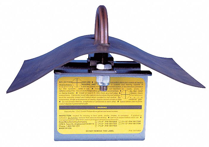 | Feature | Price For: Each Includes: Instruction Manual Attaches To: Lanyard Material: Forged Alloy Steel Tensile Strength: 5000 lb. Item: Roof Anchor D-Ring Material: Forged Alloy Steel Standards: OSHA and ANSI Weight Capacity: 310 lb. Width: 6-1/4" Depth: 9-1/4" Country of Origin (subject to change): United States |