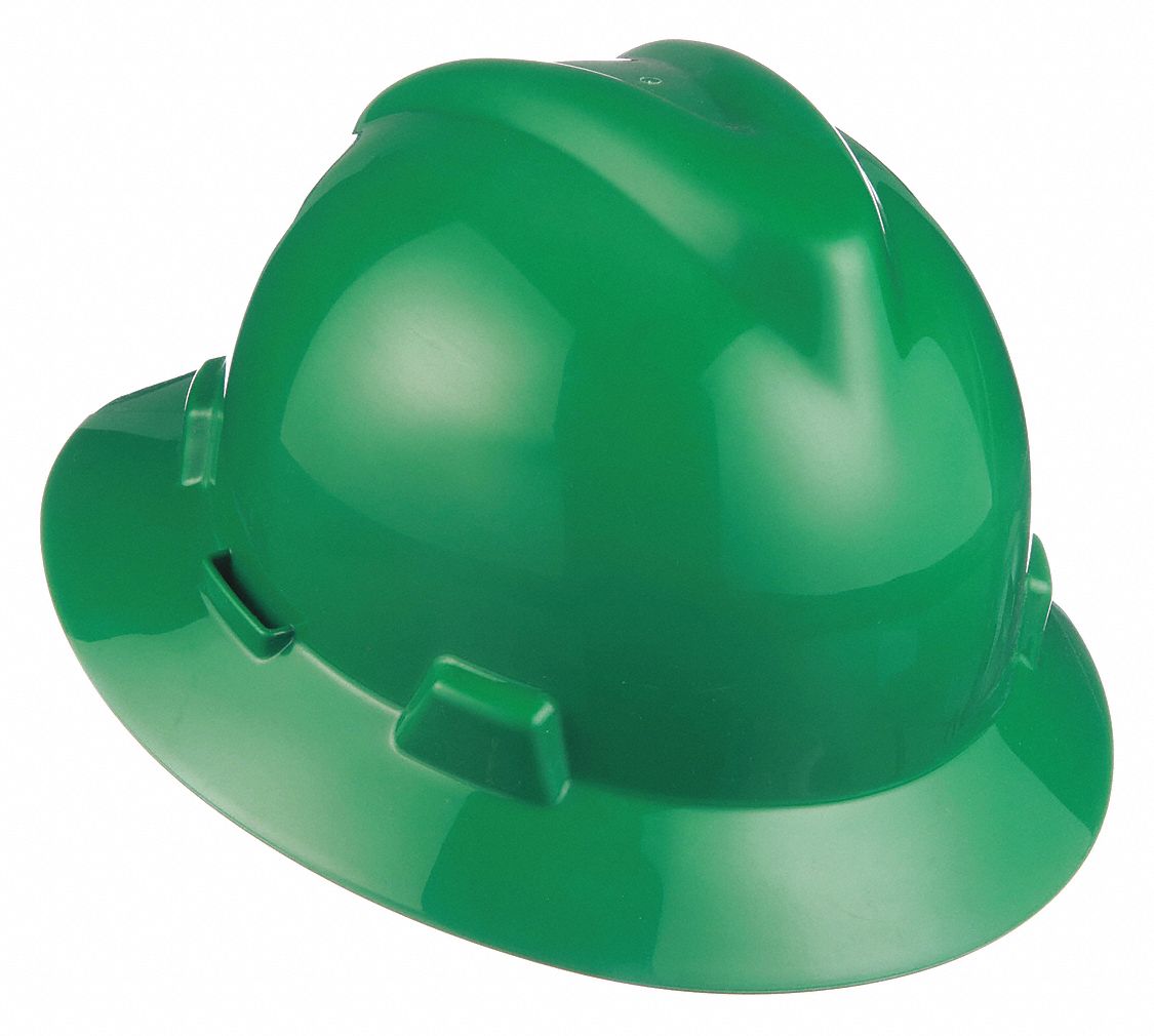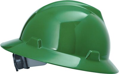 MSA Green V-Gard Class E Type I Polyethylene Non-Slotted Hard Hat With Full Brim And Fas-Trac Suspension. These V-Gard Protective Hats are part of the same family of products and accessories recognized as the best-selling in North America. Polyethylene shell and self-adjusting crown straps provide comfortable, lightweight protection. Available in slotted (to work with MSA accessories) or non-slotted. Three size options make these the ideal protectors for the entire work crew. (Purchase of 2 Each)