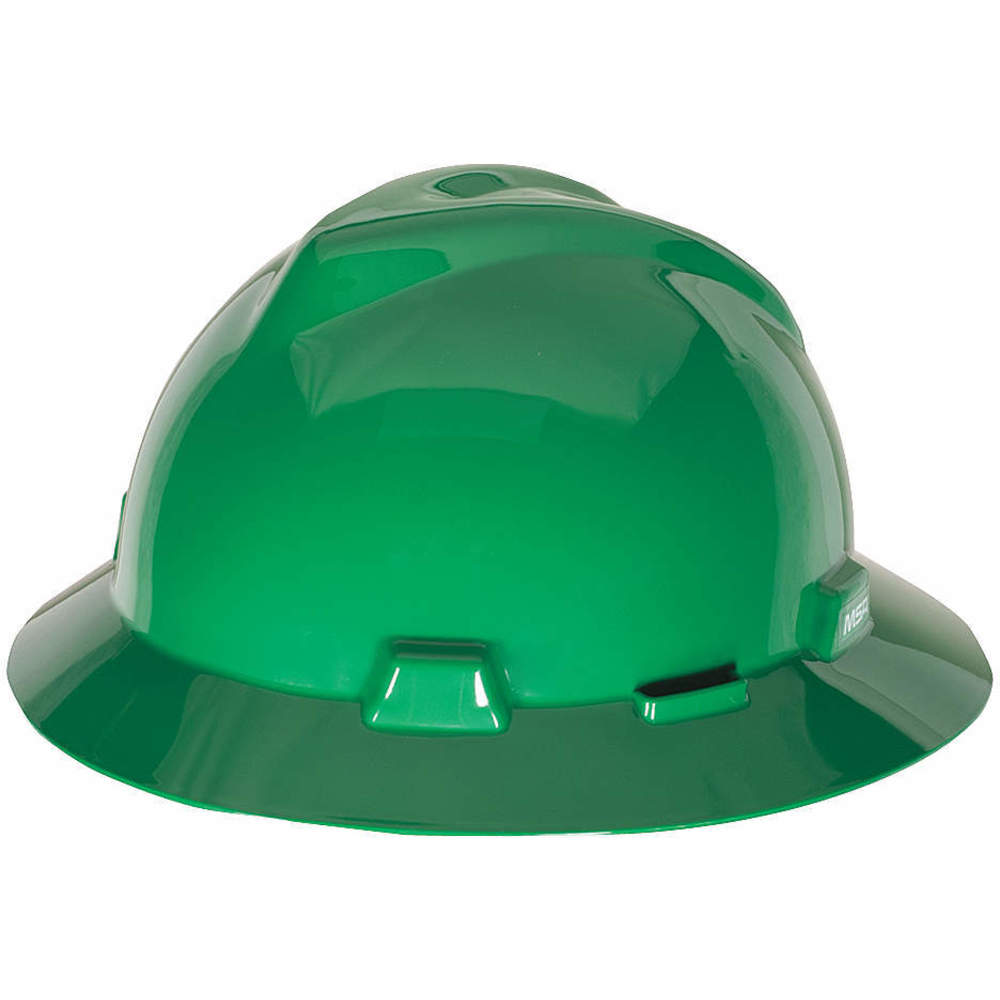 MSA 475370 V-Gard Full-Brim Hard Hat With Fas-Trac III Ratchet Suspension | Polyethylene Shell, Superior Impact Protection, Self Adjusting Crown-Straps - Standard Size in Green